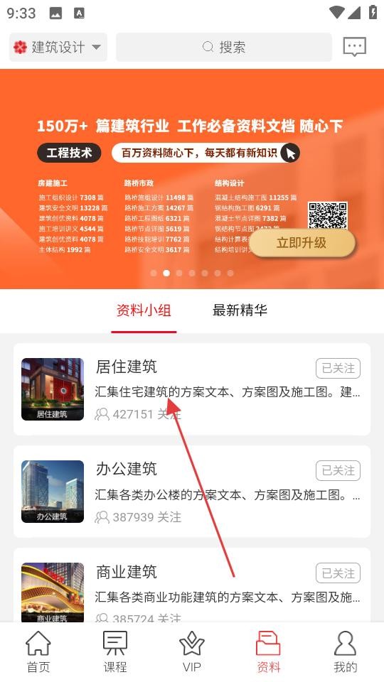 3、打开资料页面,150万建筑资料随心浏览,工程技术等分类涵盖多领域文档,资料小组有居住建筑等板块,按需关注小组,下载工作必备资料文档句号。
