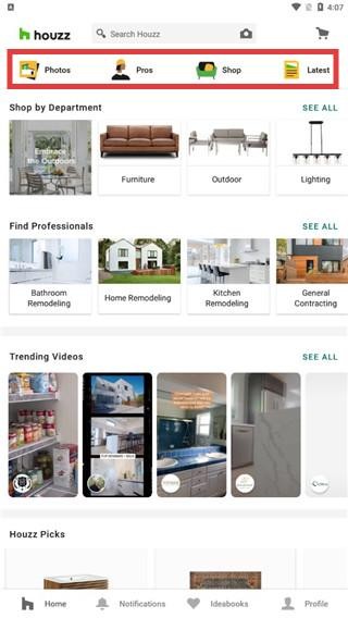 3、登录后进入应用首页,顶部有【Photos】【Pros】【Shop】【Latest】等标签,点击可切换查看不同内容,如图片、专业人士、购物商品及最新动态等,开始体验应用功能。