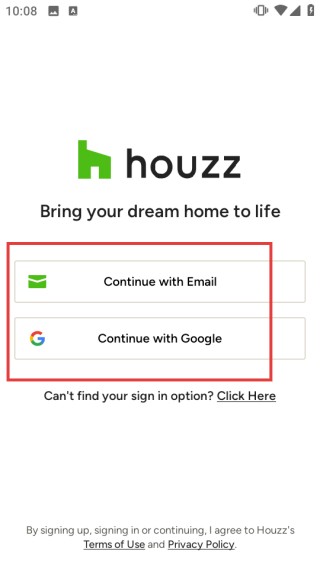 1、打开houzz室内设计app,在登录界面选择登录方式,可点击【ContinuewithEmail】或【ContinuewithGoogle】进行登录。