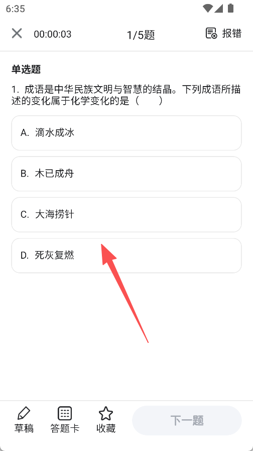 3、进入题目界面,做单选题。