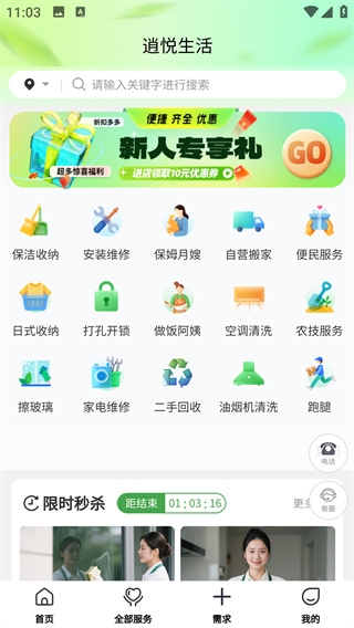 《逍悦生活》是一款专注生活服务的软件,提供保姆月嫂、保洁收纳、安装维修、做饭阿姨等多样服务,还有新人专享礼、限时秒杀等优惠活动,可通过选择服务分类、具体项目,填写地址时间后确认下单,服务丰富且流程简便,满足日常各类生活服务需求。