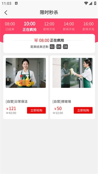 3、在首页点击限时秒杀,页面中有不同时间段的限时活动,享受到最优质的抢购活动。
