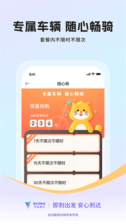 叮嗒出行app下载是一款绿色出行app,提供共享单车、助力车、公交等一站式出行服务,服务范围包含全国200多个城市,实现扫码乘车便捷出行,费用低,一键扫码,安全贴心,无需押金,超值月卡不限次数、30天免费畅骑,租车、选车,扫码开启,有需要的朋友们不要错过了。