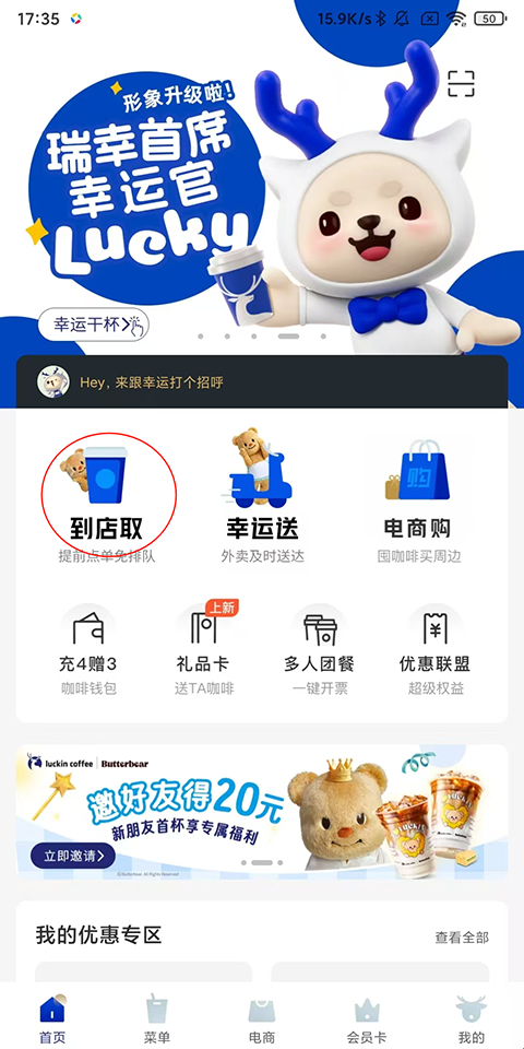 1、打开瑞幸咖啡App,进入首页后点击“到店取”图标。