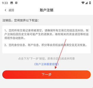 4、进入账户注销页面,阅读注销后放弃交易记录、身份信息等权益的提示,点击下一步。