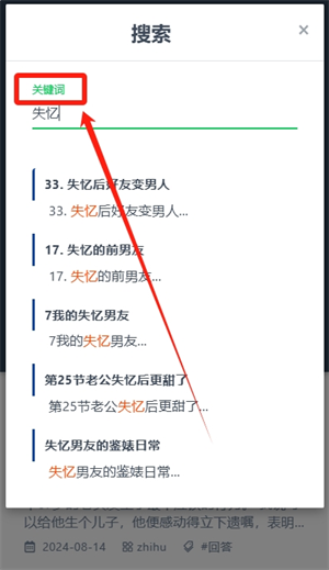 3、点击搜索后会出现搜索框,我们需要输入关键词查找对应的知乎小说,如标题;