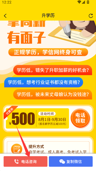 3、最后轻点“电话咨询”,一位专业的职业规划师仿佛已在线那头等候,为您量身解答升学路上的所有疑问。