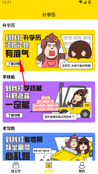 1、在首页找到并点击“升学历”按钮,仿佛按下了人生的进阶快进键,一条提升自我的崭新道路在眼前展开。