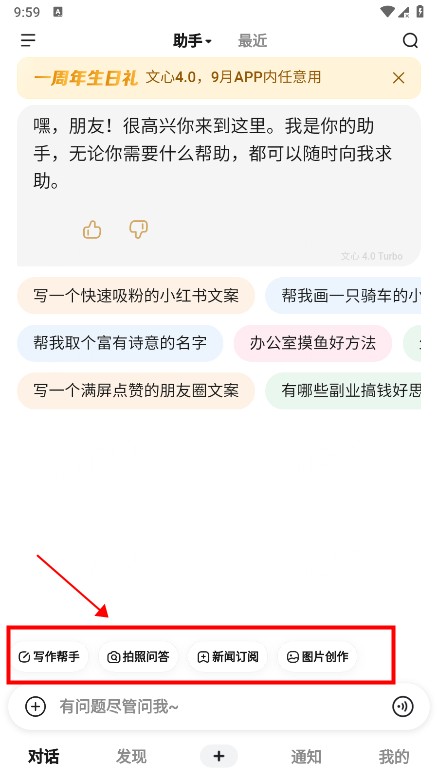 4、在首页,我们可以看到写作帮手、拍照问答、新闻订阅、图片创作等快捷助手,如果有需要的,可以直接点击使用;