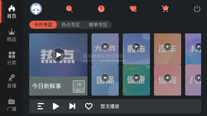 1、喜马拉雅车载版是一款能够通过车主的收听习惯分析车主喜好,利用云端大数据及人工智能算法为车主定制私人化的收听体验