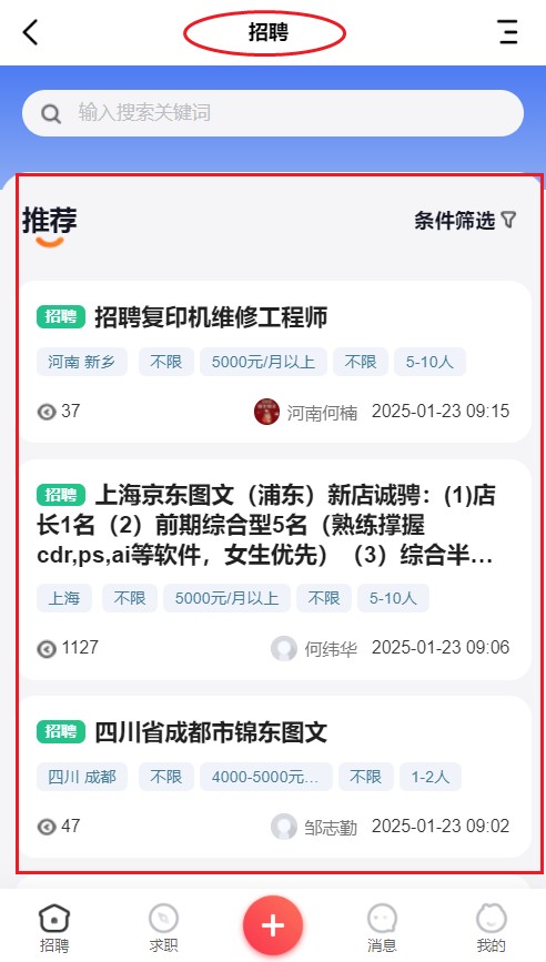 5、然后点击菜单栏中间的【+】可以发布自己的招聘求职的帖子。如图所示。