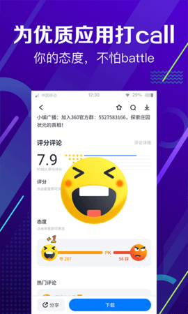 360手机管家是一款国内知名的安卓应用市场,也叫做手机助手,由北京奇付通科技有限公司开发推出,致力于为用户提供安全可靠的应用下载与管理服务。平台汇聚海量游戏、软件、音乐、小说及视频资源,通过智能推荐与精准分类,帮助用户快速发现优质内容。凭借360安全中心的全方位防护体系,所有资源均经过严格审核,确保无毒无广告,为用户打造省流量、快捷、安全的下载体验。同时支持手机备份、文件管理等实用功能,是安卓设备的必备工具。