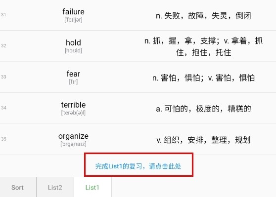 4、我们进行单词的复习,最后在最下面点击完成List1的复习