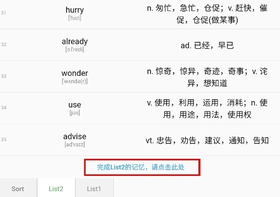 2、我们以Day2举例,记下Day2所有的单词,然后拉到最下面,点击完成List2的记忆