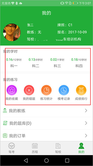 3、历程功能可以看到科目二,科三培训时长,时长达标就可以报名科二,科三考试。