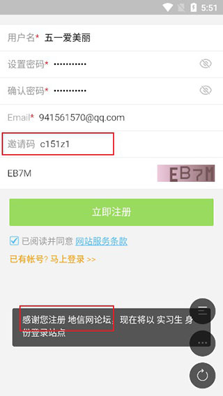 2、自定义输入用户名、密码、邮箱、以及邀请码,即可看到成功注册;