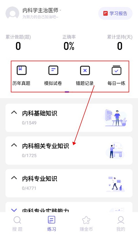 用户每天的练习都会生成学习报告,在练习页面点击右上角的“学习报告”即可查看。