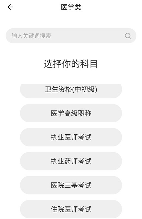 然后用户就需要在医学、建筑、财经三个类型内选择自己要考试的类型。