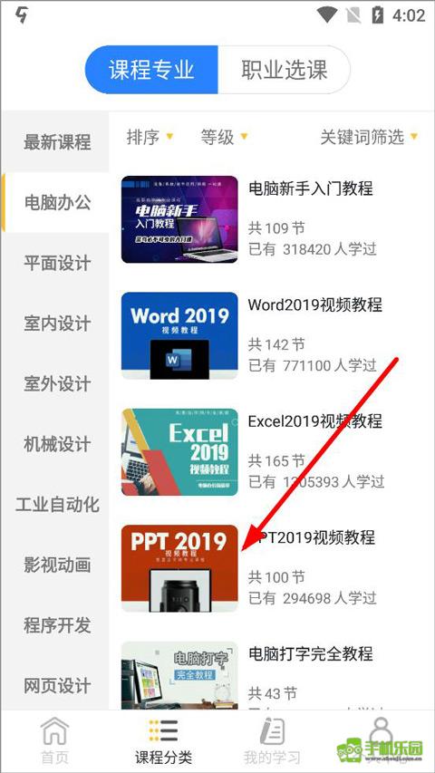 3、进入课程分类页面,有电脑办公、平面设计、室内设计、工业自动化、程序开发等课程类目,点击PPT2019视频教程;