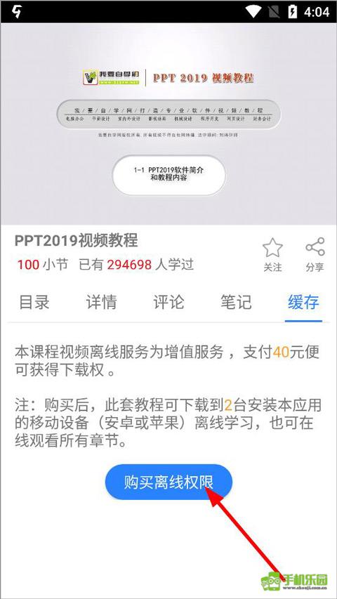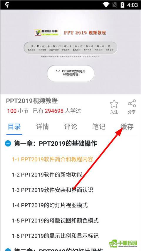 4、进入课程页面,可以看到课程的目录、详情、相关评论和缓存等功能栏目,点击缓存;