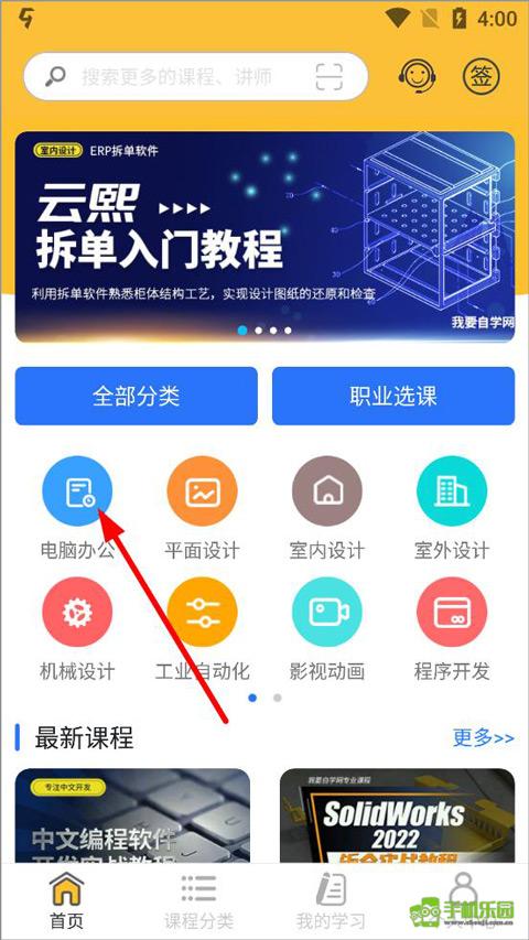 2、登录后,进入首页,首页由部分课程分类和职业选课、最新课程等组成,点击要购买课程的分类;