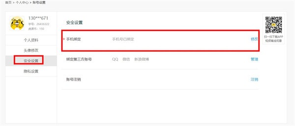 3、进入到页面后,选择“安全设置”在这里就可以修改自己的手机号,