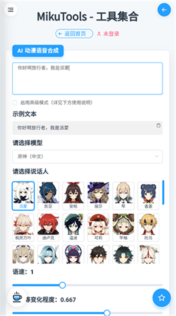 mikutools原神语音合成是一款非常好用的游戏工具软件,可以使用这款软件来合成你喜欢的原神角色语音包,派蒙,钟离,阿贝多,温迪,万叶,芭芭拉以及可莉等等都应有尽有,满足不同用户的喜好,操作简单好上手,此外还有数据换算,图片相关等功能可以体验,非常实用。