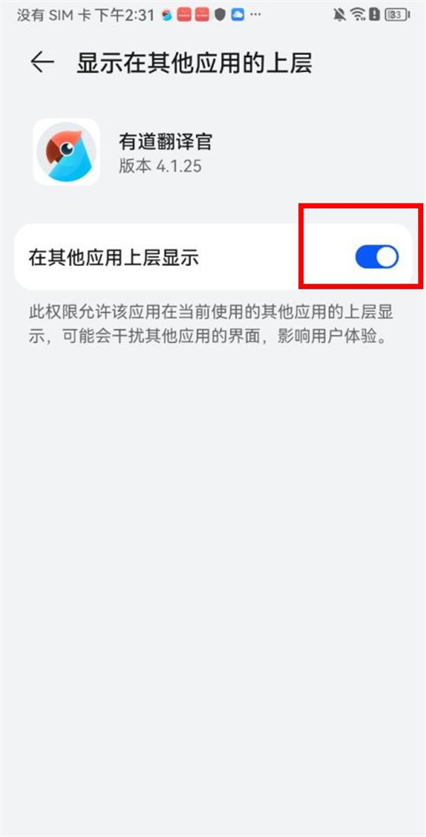 4、大家可根据自身手机设置来进行设置,如小编所示点击开启【允许显示在其他应用上方】的按钮即可