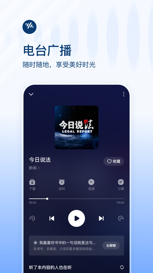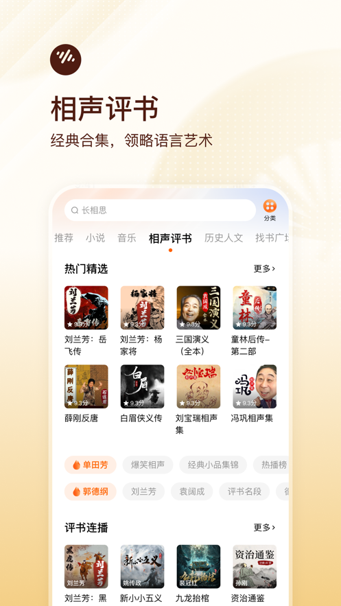 3、可以听歌,也可以听相声评书,音乐内容很丰富。软件能够适合各个年龄段的网友下载使用。