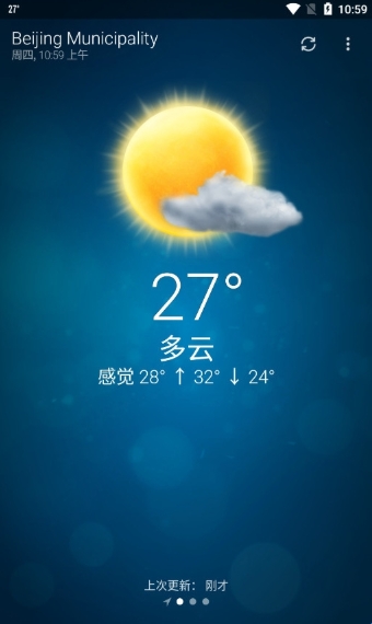 首页直接显示当前天气,数据每15分钟自动更新一次。若需手动刷新,下拉页面即可。