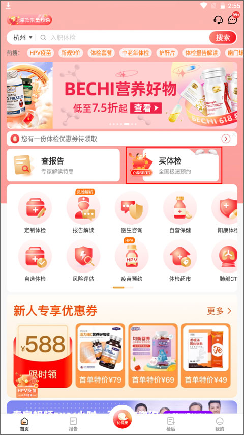 1、打开进入优健康app首页后,点击屏幕上方的“买体检”功能板块。