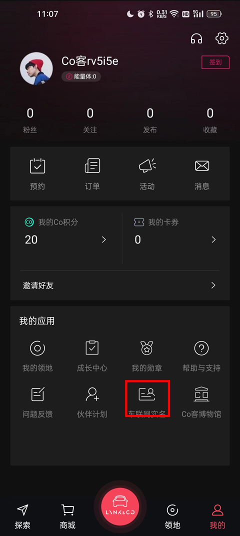 3、我的页面拥有很多功能,但我需要在我的应用里面找到“车联网实名”点击进入;
