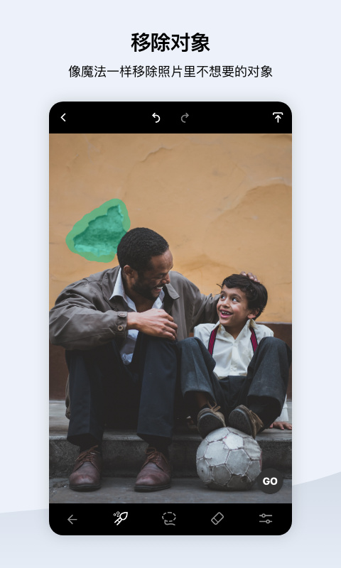 1、删除物体:照片中出现了乱入者?想去除照片中的特定物体?那就使用「删除物体」功能吧。只需对准物体,使用画笔涂抹,然后点击右下角的「GO」按钮,就能让一个庞然大物瞬间消失。