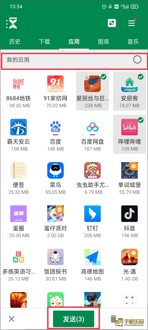 2、在传输板块中,勾选你想要传输的应用、图片、音乐等,选择好后点击下方的发送按钮。