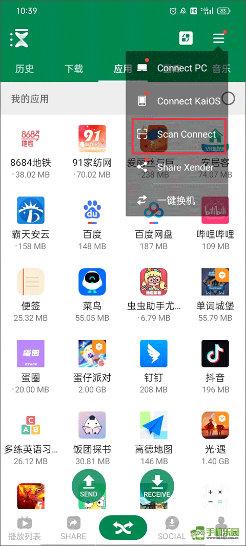 5、另外一部手机则需要点击右上方的三横图标,点击“Scan Connect”。将扫描框对准这个二维码即可快速互传相对应的应用、图片、音乐等内容。