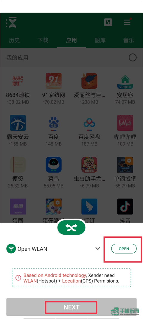 注:基于Android技术,Xender需要WLAN(热点)+定位(GPS)许可。